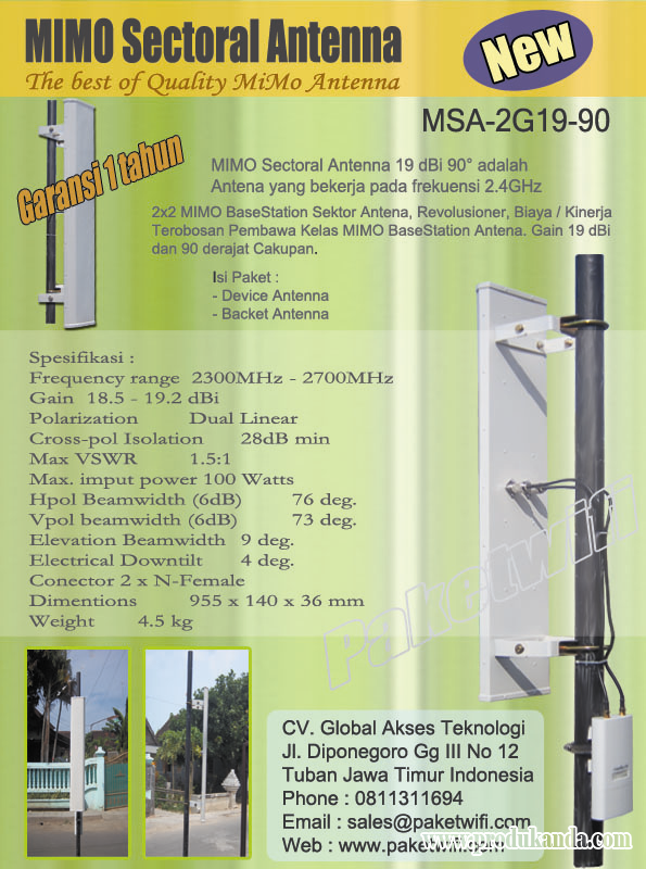 MIMO Sectoral Antenna 19 dBi 90° ini adalah Antena yang bekerja pada frekuensi 2.4GHz 2x2 MIMO BaseStation Sektor Antena, Revolusioner, Biaya / Kinerja Terobosan Pembawa Kelas MIMO BaseStation Antena. Gain 19 dBi dan 90 derajat Cakupan. Memiliki Througput dan yang lebih besar dibandingkan dengan antenna Biasa, sehingga Signal lebih merata dan lebih bagus untuk segala medan